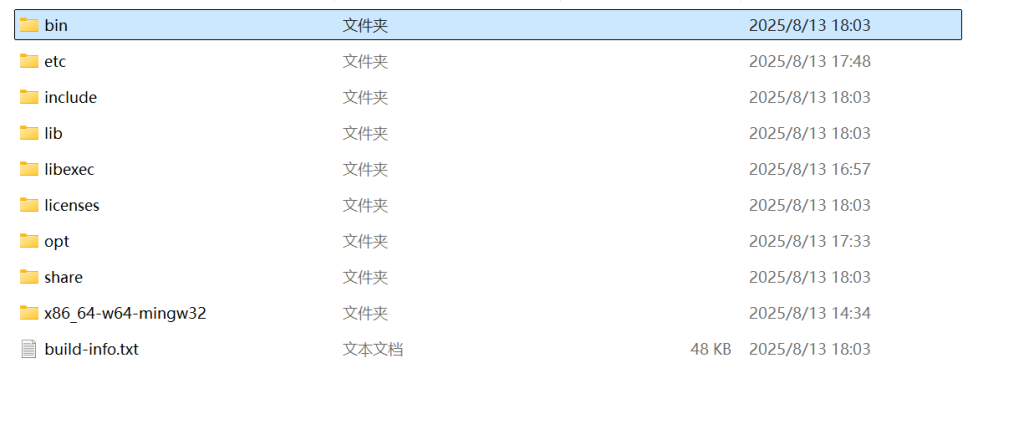 2.1.在你的电脑硬盘中选一块风水宝地解压WinGW,解压后会有如下文件(夹)